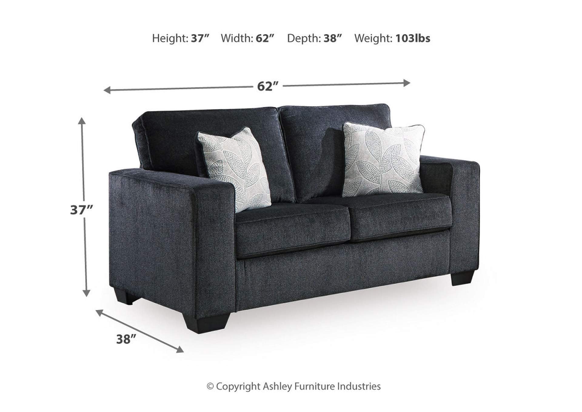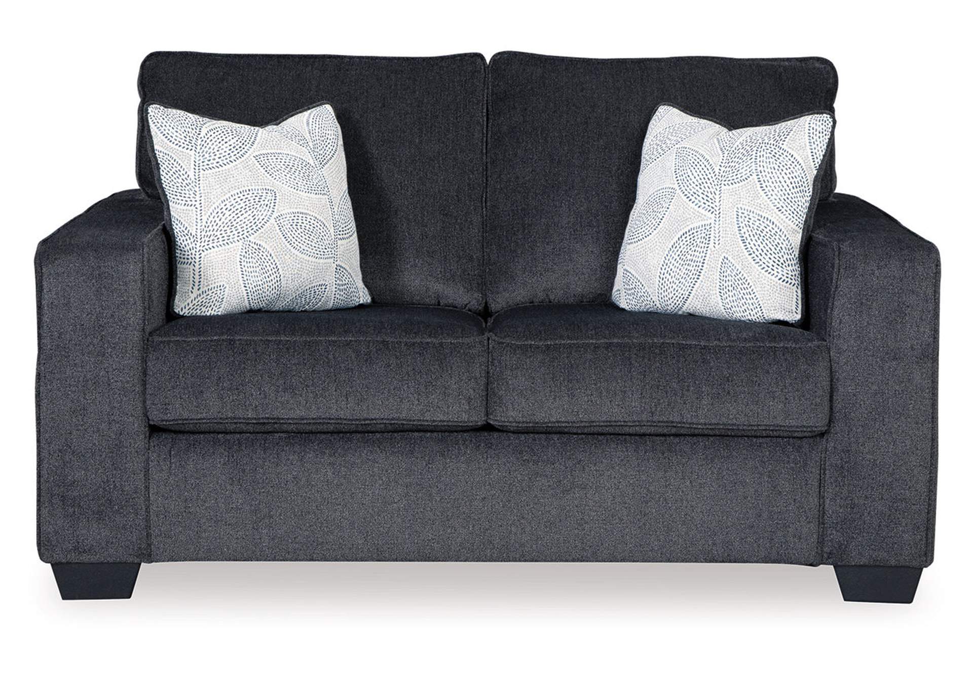 If style is the question, then the Altari loveseat is the answer. Sporting clean lines and sleek track arms, the decidedly contemporary profile is enhanced with plump cushioning and a chenille-feel upholstery that's so pleasing to the touch. Sure to play well with so many color schemes, this loveseat in slate gray includes a pair of understated floral pattern pillows for fashionably fresh appeal.