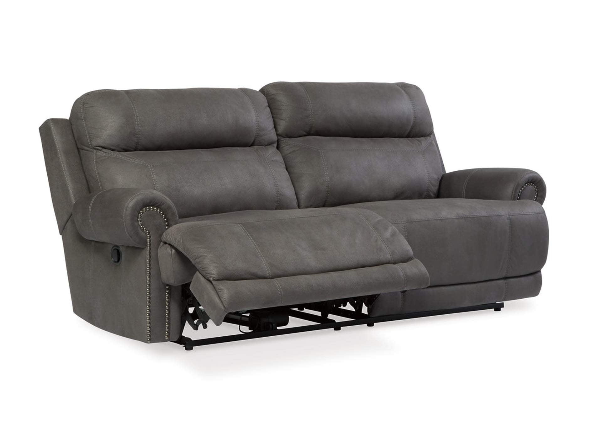 Sparing that "puffy" look you might expect from a recliner, the Austere reclining sofa and loveseat set doesn't hold back when it comes to contemporary style. Subtle touches such as sporty jumbo stitching, nailhead trim and a "weather worn" effect on the upholstery give this handsome set a buttoned-up appeal and fresh feel. Loveseat’s center console with dual cup holders brings a handy element to the arrangement.