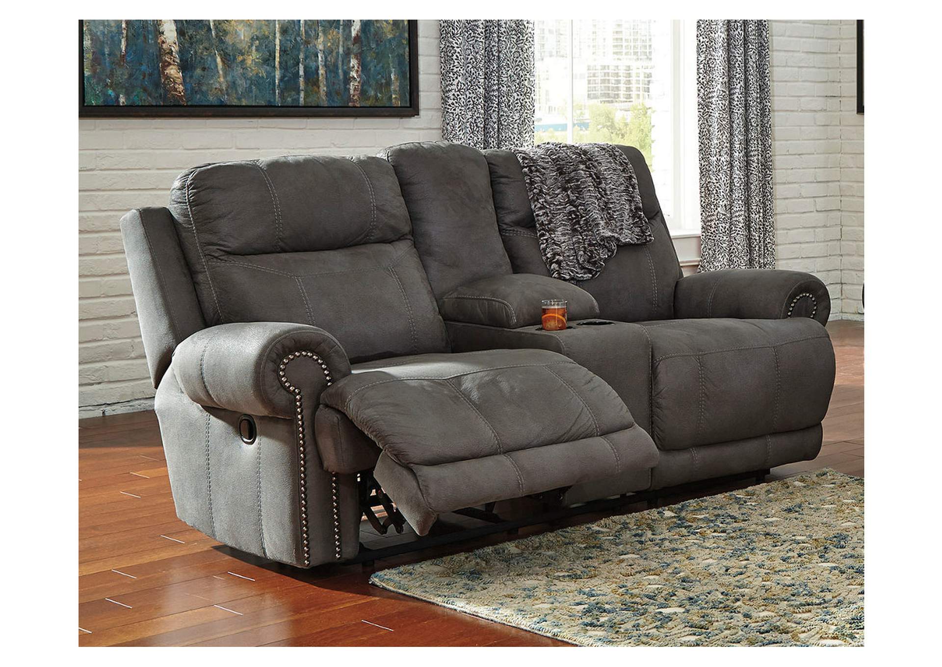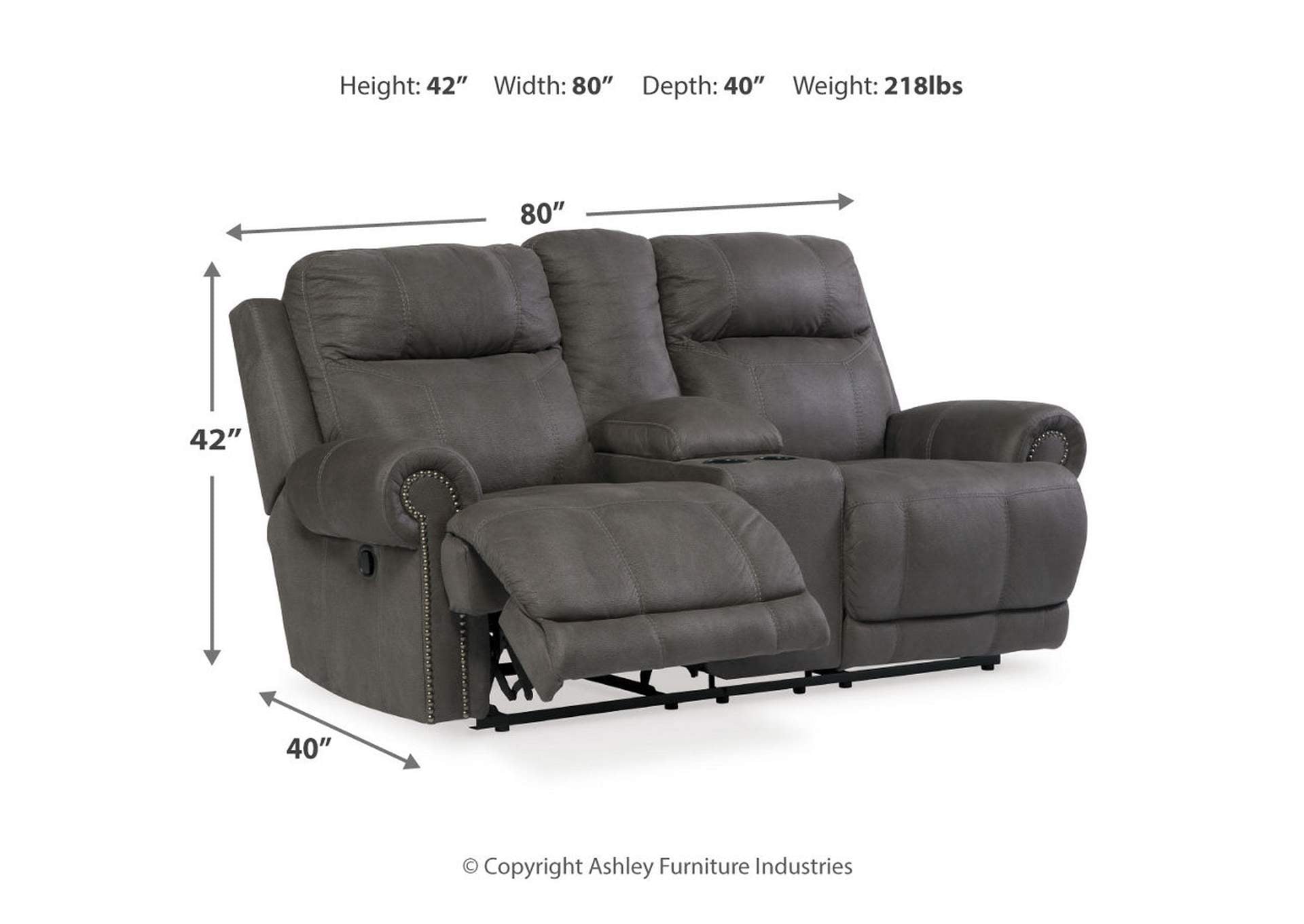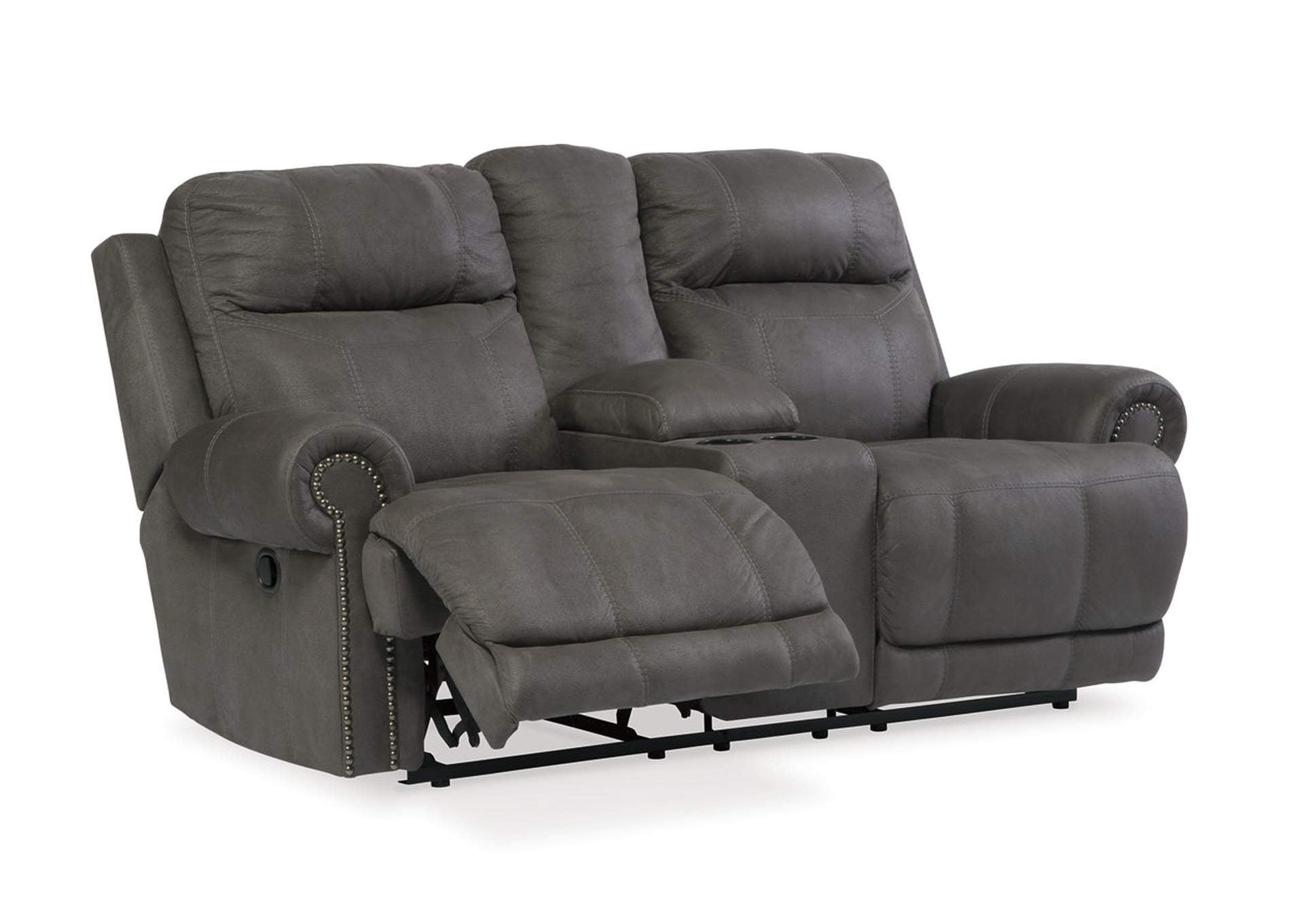 The Austere reclining loveseat with console lives up to its name—if we’re talking sparing that "puffy" look you might expect from a recliner. When it comes to contemporary style, it doesn't hold back. Subtle touches such as sporty jumbo stitching, nailhead trim and a "weather worn" effect on the upholstery provide a buttoned-up appeal and fresh feel. Center console with dual cup holders brings a handy element to this handsome piece.