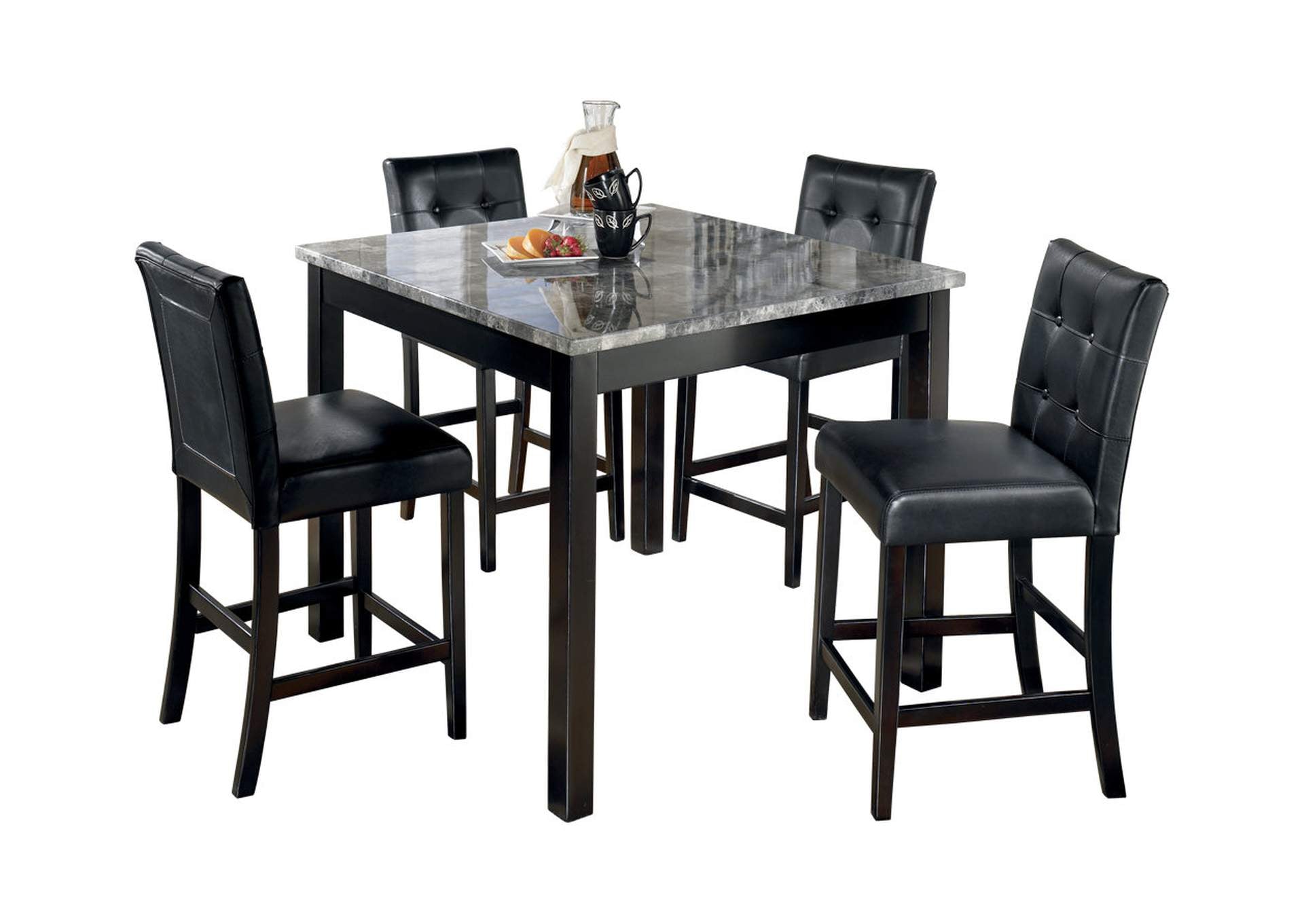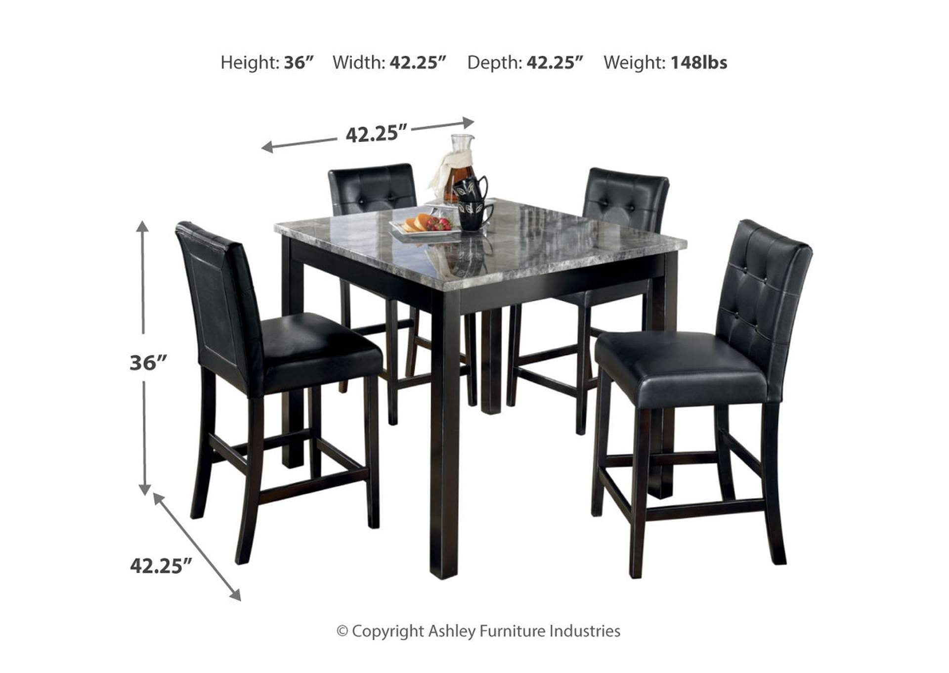 The square shape of the Maysville counter height table offers comfortable dining without taking up too much space. Faux marble tabletop has a polished look that's easy to clean. Cushioned counter stools are tufted and covered in faux leather and slide neatly under the table when not in use.