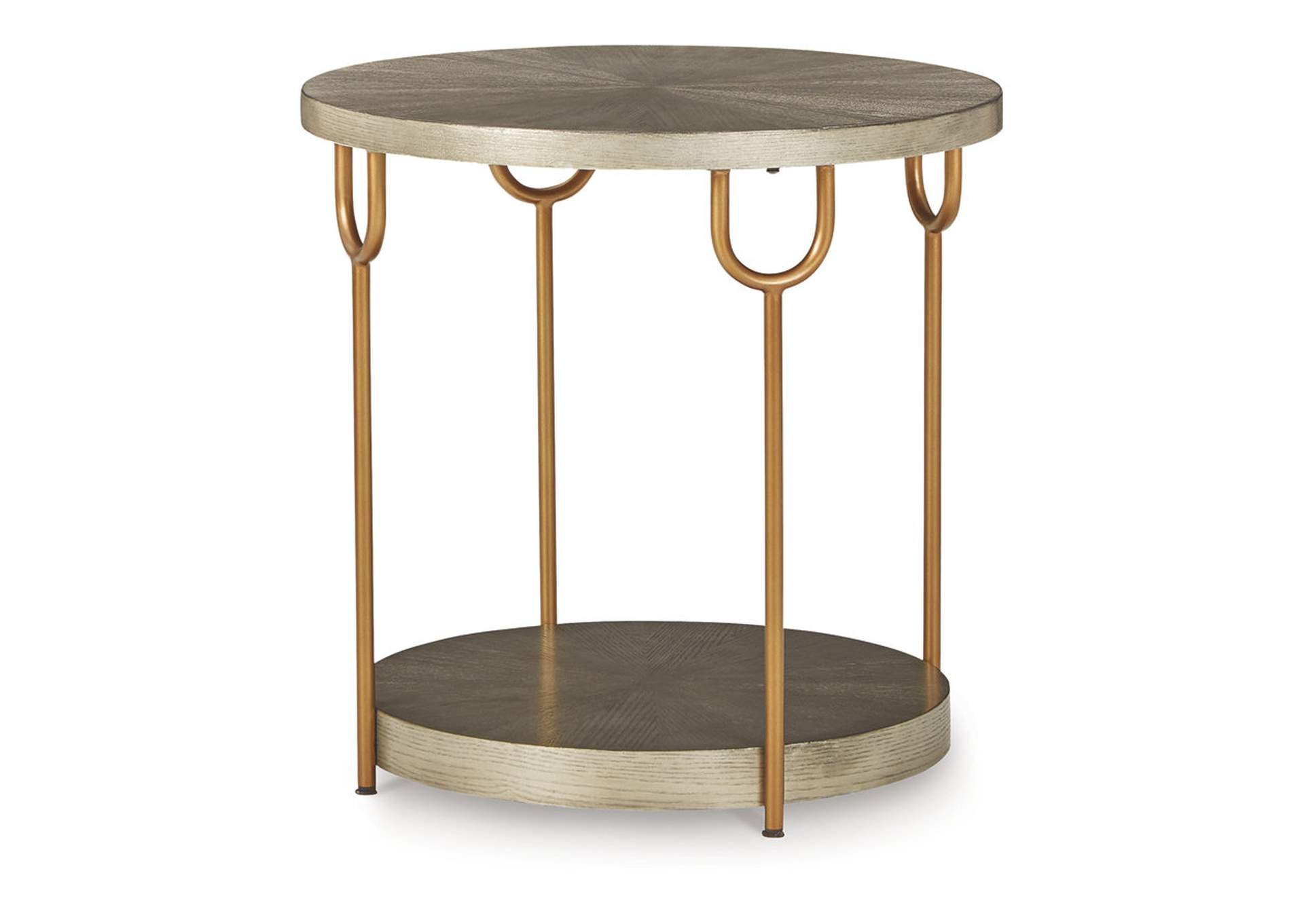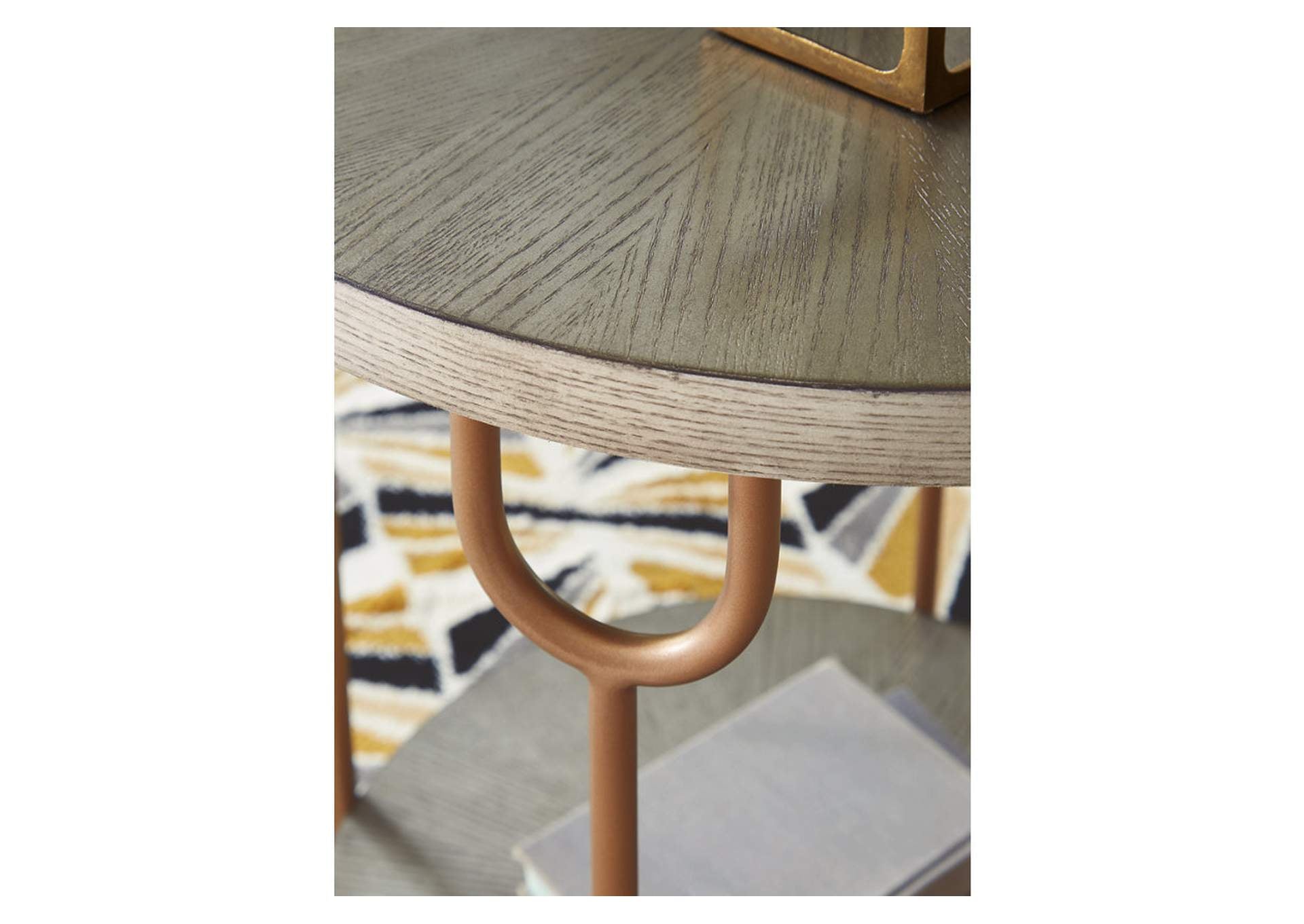 With the addition of a striking accent piece, one can take any room from ordinary to extraordinary. And the Ranoka round accent table has just what it takes to elevate your home's decor to astonishing new heights. Made with wood veneer in a warm metallic silvertone finish and complemented by metal tubular legs, its artful composition and spartan design mesh seamlessly into any modern living space.