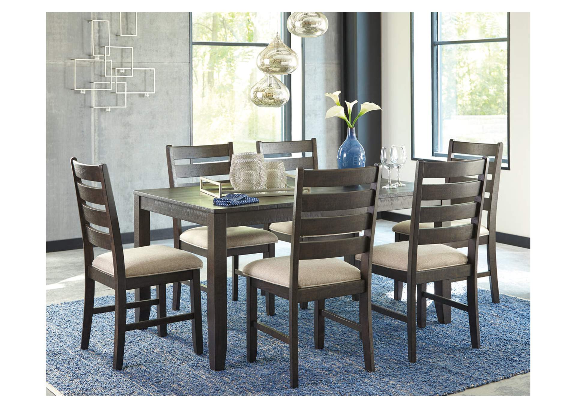 You love a clean and contemporary look—so long as it’s warm and inviting. With that in mind, the Rokane dining table set serves your sense of style beautifully. “Rough sawn” style finish with a hint of weathered charm tantalizes with a mood of relaxed elegance. Sumptuously upholstered seats in a neutral, textural fabric make the experience complete.