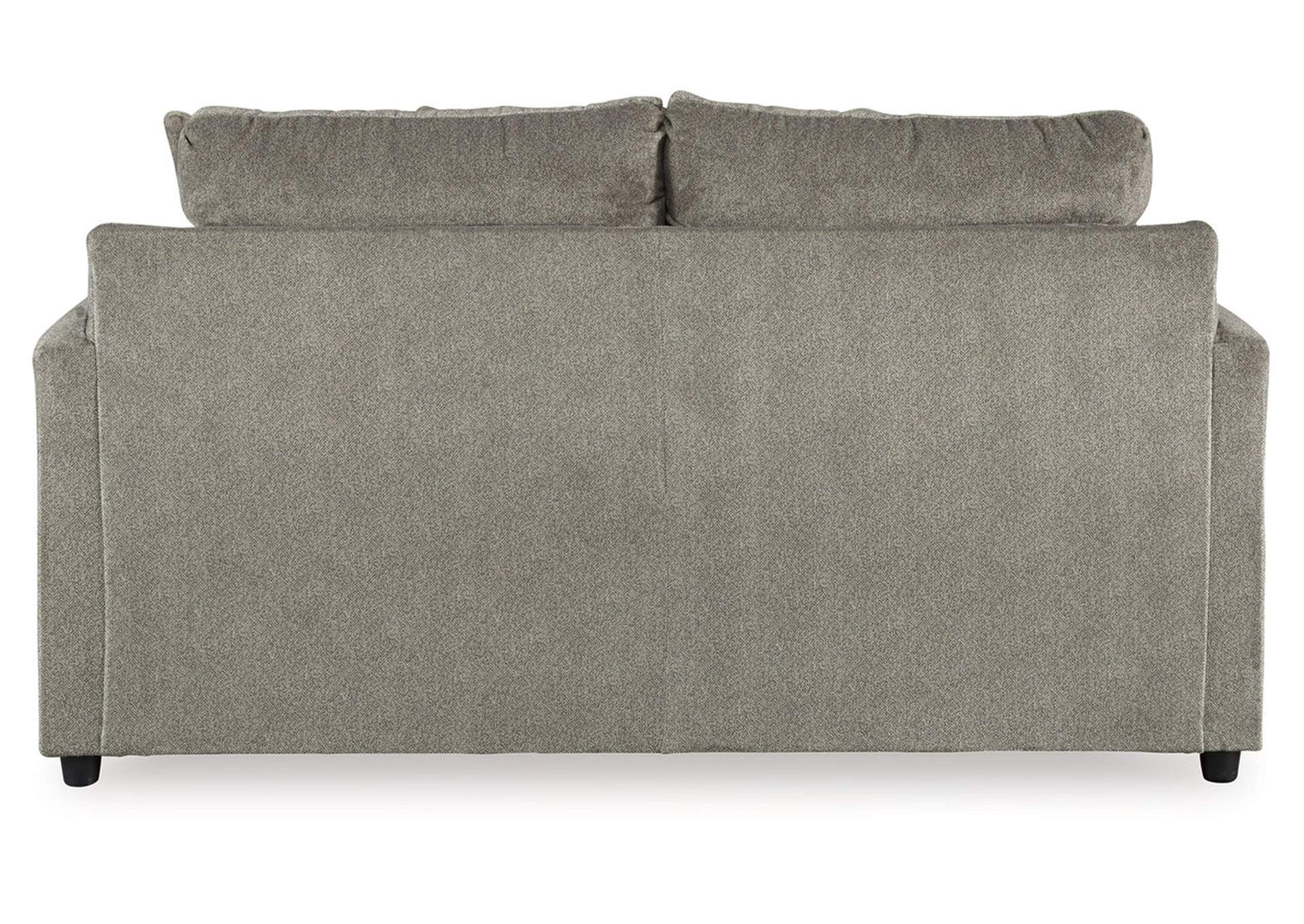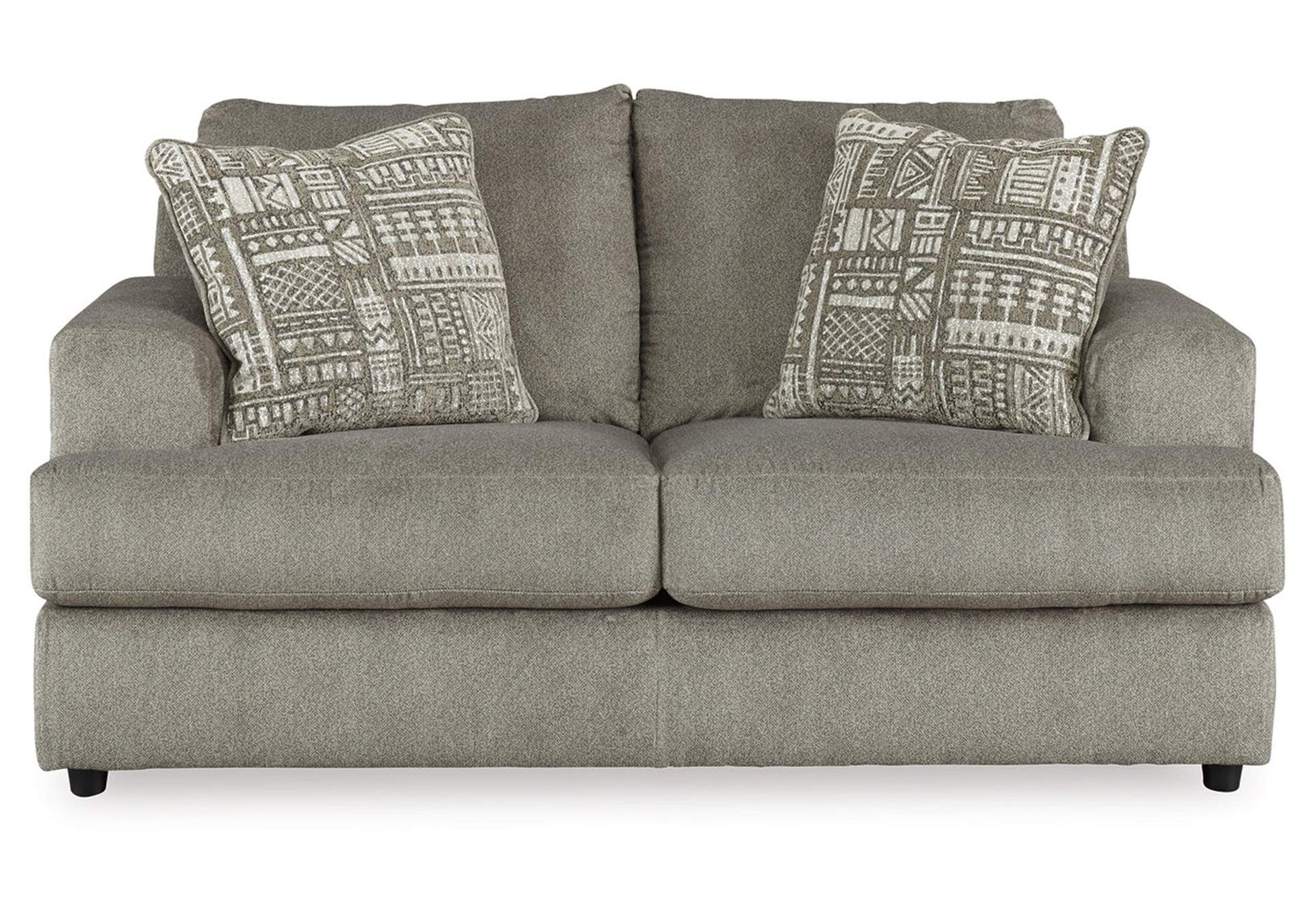 Flaunting a trendsetting silhouette, the Soletren loveseat puts the contemporary in your contemporary home. Its “three over two” profile eliminates the center seat cushion, giving you elongated plushness and deep seating. And the microfiber fabric satisfies your need for a piece that feels as good as it looks. Soft jacquard chenille throw pillows add a splash of geometric pattern and color contrast.