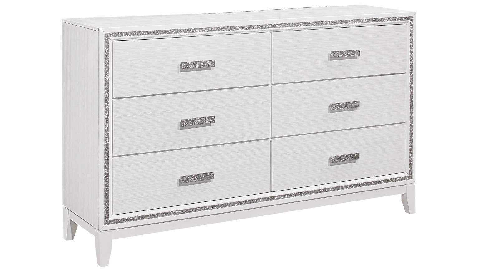 Transform your bedroom into a high-fashion retreat with the Tala 5-Piece Bedroom Set. This collection is designed for those who love a clean, monochromatic look with a touch of "glam." Finished in a brilliant crisp white, each piece features a signature glitter-inlay border that catches the light from every angle.